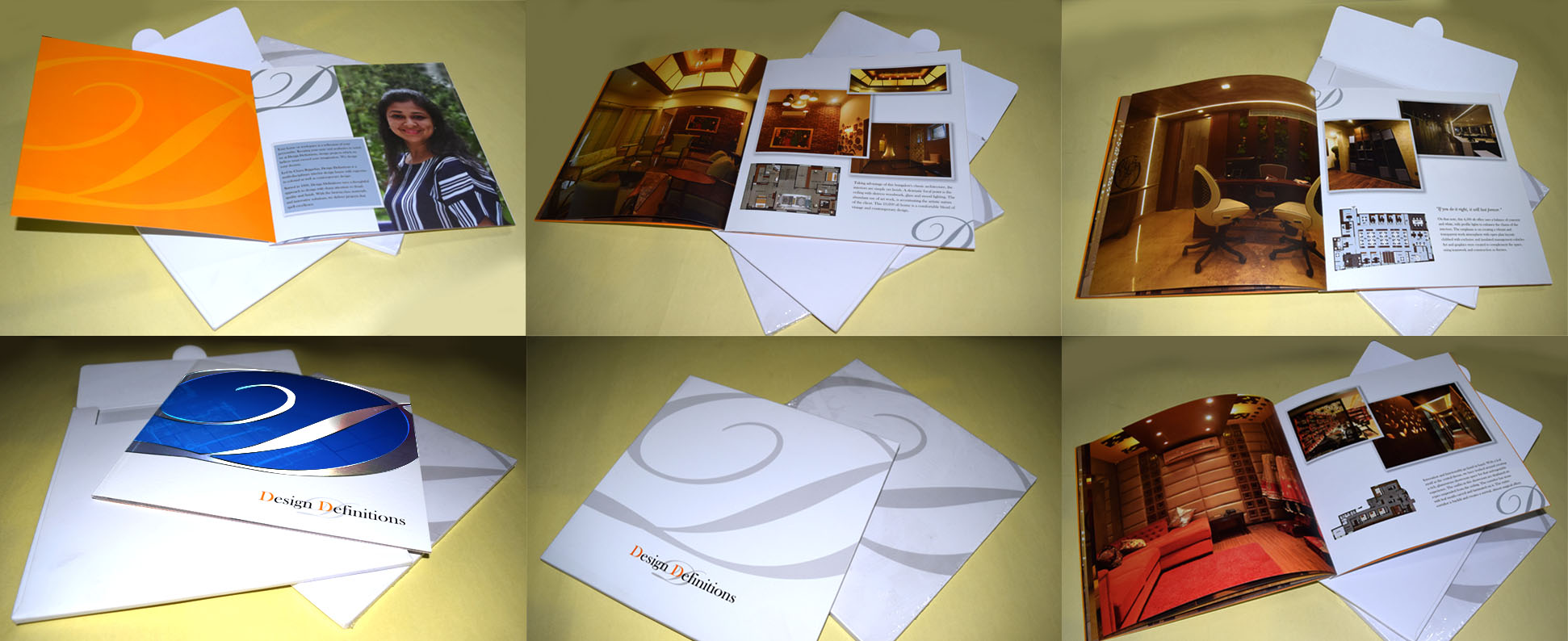 One of the finest interior designer of Kolkata, Mrs. Charu Rajgharia wished to make a portfolio brochure of her company, Design Definitions. The requirement was to create a brochure with minimal theme, focussing on the project snaps along with brief description.